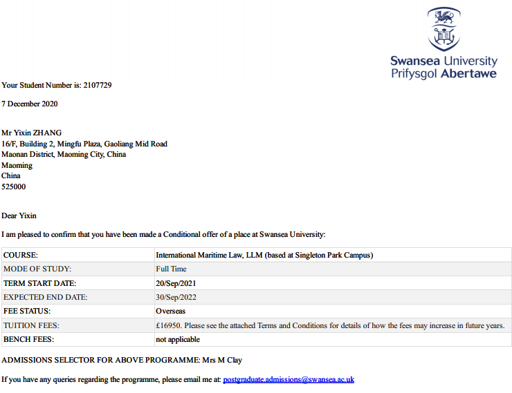 (海运学院 国际交流学院供稿)日前,海运学院2017级张艺馨同学被英国斯旺西大学法学院海商法专业录取,并获1000英镑奖学金,成为2020年我校首批被海外合作院校录取继续攻读硕士学位的学生。