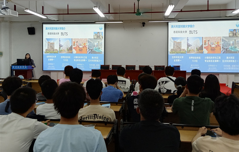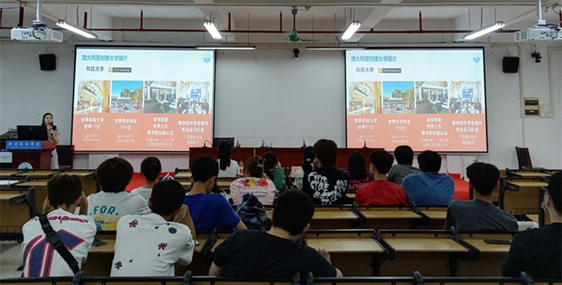 澳方合作大学校方代表崔老师详细介绍了中澳“3+2”项目的课程设置、专业设置以及对应的澳方合作大学悉尼科技大学与科廷大学的入学要求,其中重点介绍了澳中国际文化交流协会为中外合作项目学生创立的独具特色的五位一体平台(学术互动平台、创新创业平台、校园导师平台、英语辅导平台、创新科技智能平台),以及悉尼科技大学与科廷大学的校情。