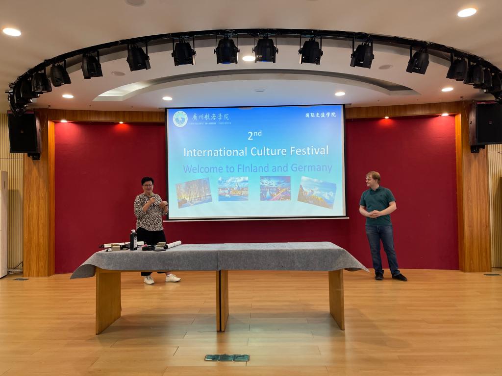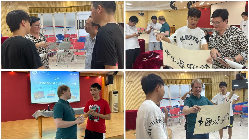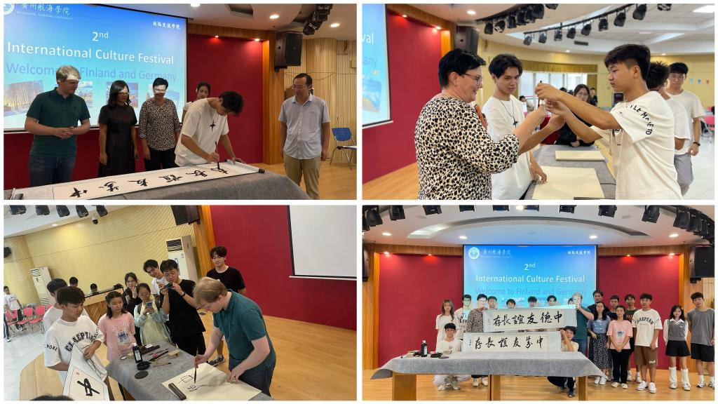 我校书法协会的成员系统地介绍了中国书法的文化内涵,现场示范毛笔书法,分别题写“中芬友谊长存”和“中德友谊长存”赠给外教。Anne和Tobias老师对书法艺术展现出浓厚的兴趣,积极加入书法写作中来,同学们耐心地教外教书写,细心讲解其中的要领,带外教体验博大精深的书法艺术,感受汉字书法之美。