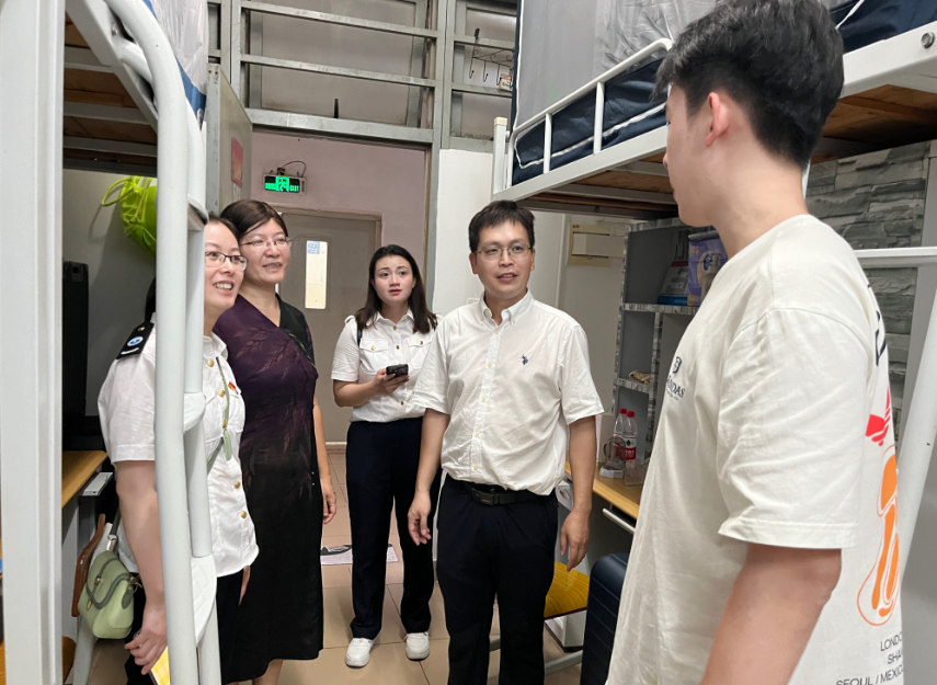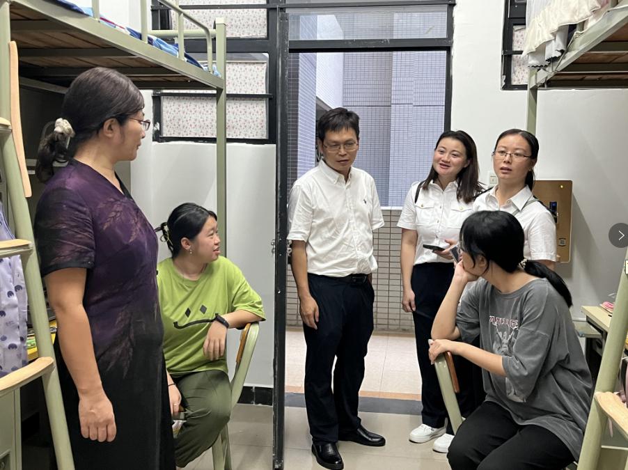 当天傍晚,李虹、黄赞带队到宿舍区看望新生,与新生面对面交流,他们关切询问新生对新环境的适应情况,以及在学习、生活上是否有困难和需求。辅导员们也积极地参与到谈话中,他们分享自己在大学时期的经历并提供建议,鼓励新生积极面对挑战,尽快融入大学生活。