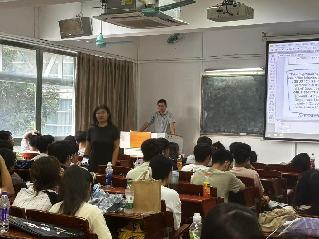 黄赞就选课指引、实习实践要求以及语言要求等方面进行了详细解读。他提醒同学们在选课过程中要充分考虑自身兴趣和发展方向,合理规划学习路径。他还强调了实习实践的重要性,鼓励同学们合理规划实习时间,根据自身选择的培养模式,积极参与国内或国外实践活动,提升自己的综合素质和专业技能。