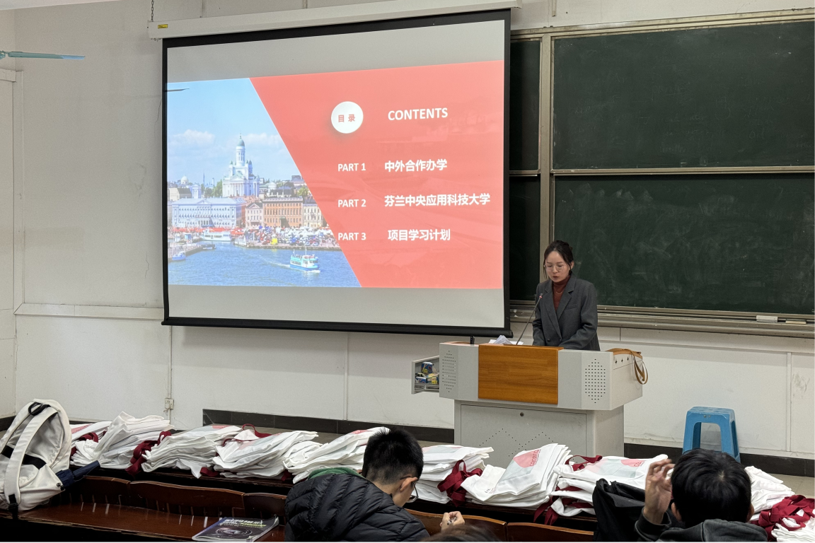 随后,芬方驻校老师周青青也详细介绍了芬兰中央应用科技大学的校情、“3+1”办学模式以及芬方学校申请入读要求等方面内容,并表达了对中芬项目学生未来留学芬兰中央应用科技大学的期待。