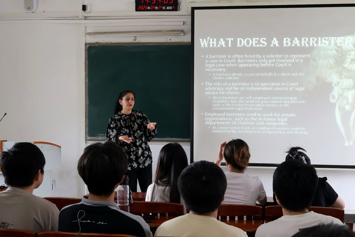 Tabetha Kurtz-Shefford以英格兰、威尔士及北爱尔兰司法体系为核心,系统解析了英国普通法传统的演变路径及其全球影响力。她通过案例对比,生动阐释了出庭律师(Barrister)与事务律师(Solicitor)的职能分工、司法实践中的程序特色,以及英国法律体系在判例法、司法独立性和法律职业共同体建设方面的独特规律。在互动环节,我校师生踊跃提问,Tabetha结合英国司法实践一一解答,现场掌声不断,气氛热烈。