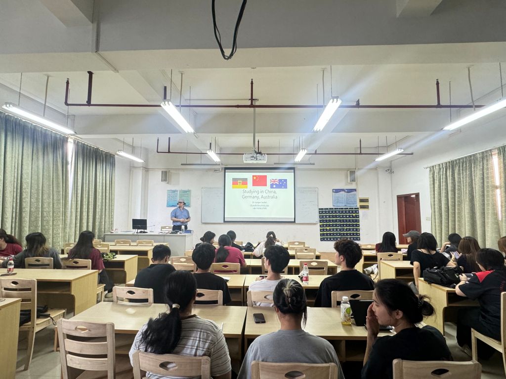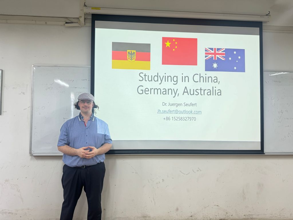 讲座中,Juergen从制度设计、文化基因与实践范式三大维度切入,系统对比中、德、澳三国高等教育体系的差异化特征。以德国“双元制”教育模式与职业导向型大学的运作为例,剖析了欧洲高等教育一体化背景下德国高校的产教融合机制;同时结合澳大利亚教育体系的市场化创新,阐释了其以学生能力为中心的弹性学分制度。针对中国高等教育的特色,Juergen高度评价近年来中国高校的“应用型转型”探索,并围绕我校中德合作项目的实践案例,探讨了跨文化语境下的育人方式。