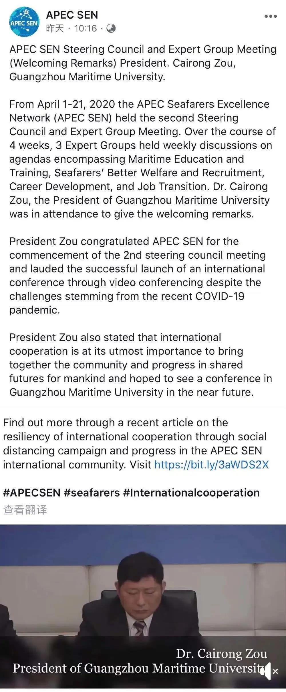 (粤港澳大湾区航运研究院供稿)2020年4月1日-21日,亚太经合组织船员卓越网(APEC SEN)第二届指导委员会及专家工作组国际视频会议召开,中国、韩国、马来西亚、墨西哥、新西兰、越南、美国、菲律宾、中国台北、智利、秘鲁等11个经济体30多名代表参加了会议,我国由中国海事局、大连海事大学、明胜m88官网派员参会。会议的主要内容是对海事教育与培训工作组,海员福利工作组,海员招聘、职业发展、工作转换工作组提交的提案文件进行讨论,探讨共同促进航运业可持续发展。