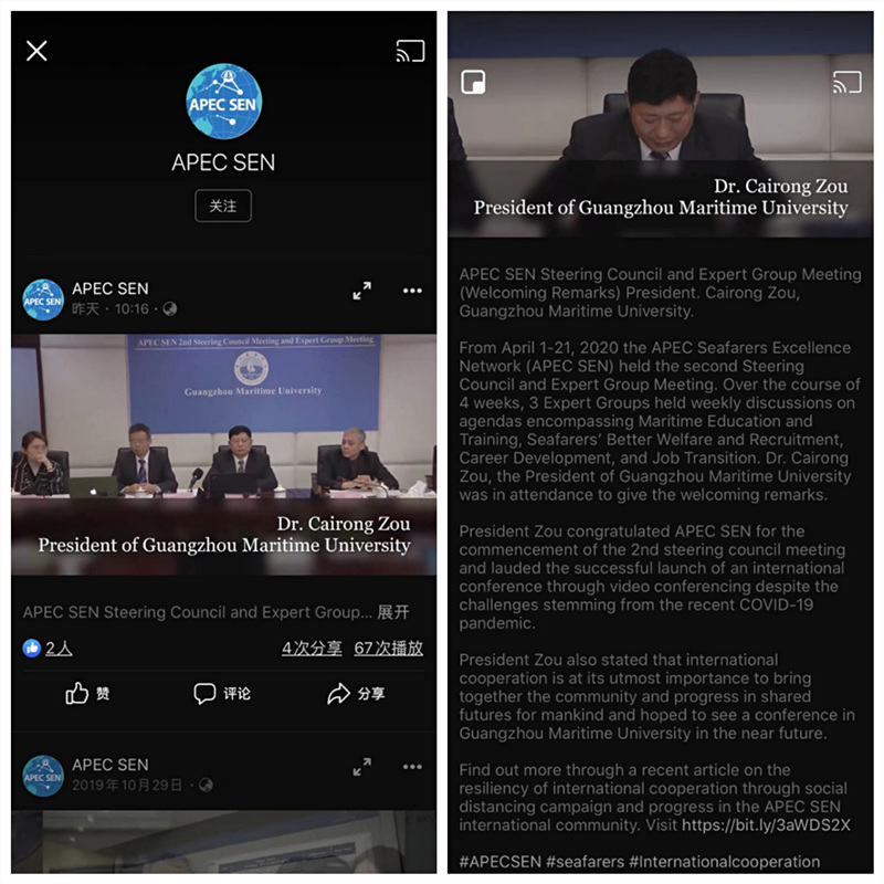 4月3日上午,我校党委书记、校长邹采荣出席会议致欢迎辞,他表示原计划在我校举办的这次国际会议受新冠肺炎疫情影响改为视频会议,我校将一如既往地支持APEC SEN工作,希望通过共同努力、加强国际合作,进一步促进国际航运业智能化、生态化、安全化的高质量发展,并预祝本次会议圆满成功。我校副校长毕修颖作为海员招聘、职业发展和工作转换第三专家工作组的主席,分别于4月3日和4月17日主持了该会议,学校粤港澳大湾区航运研究院沙正荣教授与王安琪老师全程参加会议。