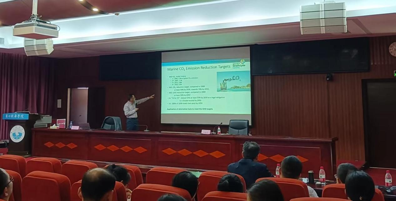 下午,周培林教授在我校六楼会议室开展科研学术讲座和联合培养项目推介讲座。参加科研学术讲座的有我校船舶与海洋工程学院、轮机工程学院的老师35人。周教授分享了近几年英国思克莱德大学轮机工程学院的研究项目,重点介绍近几年研究热点—航运业可替代燃料的低碳或零碳排放的应用研究,并展示了周教授在储罐安装、氨相关风险和风险缓解方面的一些研究成果。讲座最后,我校多位老师就该研究领域的技术难点及突破点与周教授进行了交流探讨。